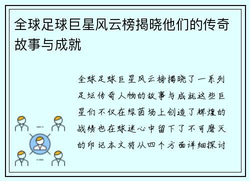 全球足球明星赛场表现排名揭晓,吸引了无数球迷的关注。在这份排名中,新一代传奇球员的崛起令众多老牌巨星感受到了压力。文章将从四个方面详细探讨这一话题:首先是新一代球员的技术特点与踢球风格,其次分析他们在比赛中的关键表现,再者讨论他们对球队和联赛的影响,最后展望未来这些年轻球员如何塑造足球的新格局。通过这些分析,我们将更全面地理解当今足球界新星们的价值及其潜力。 1、新一代球员的技术特点 近年来,随...